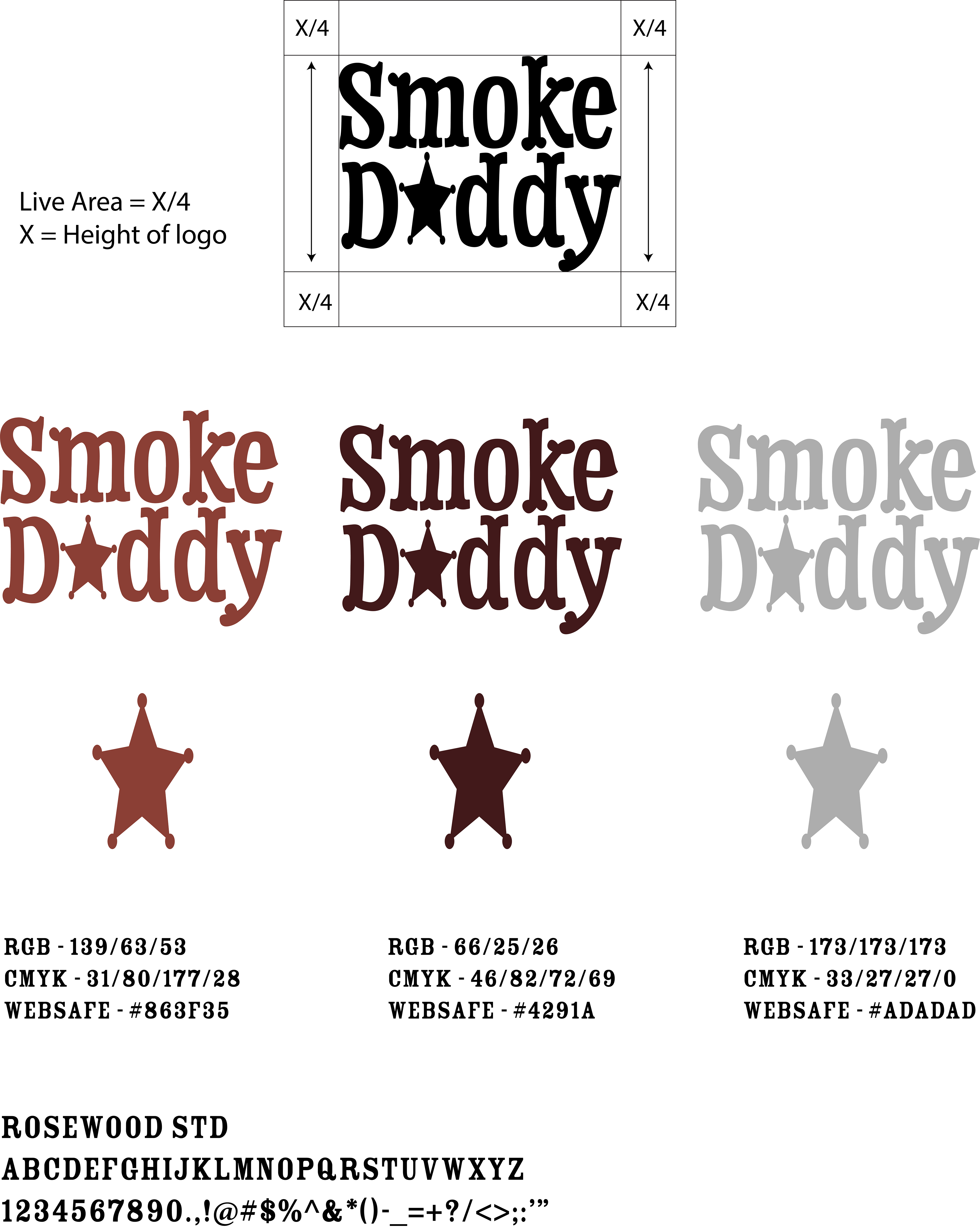 The results of the Smoke Daddy logo successfully represents "the best in town" by referencing the Sheriff's stars. The look and feeling of the logo is nostalgic-like cooking out with Dad. The primary font for Smoke Daddy is Rosewood Std because it represents "the best in town" by referencing the Sheriff's star. The alternate colors that are used for Smoke Daddy represents the meat color along with the primary color for smoke. This references the types of smoke that multiple restaurants use for cooking.